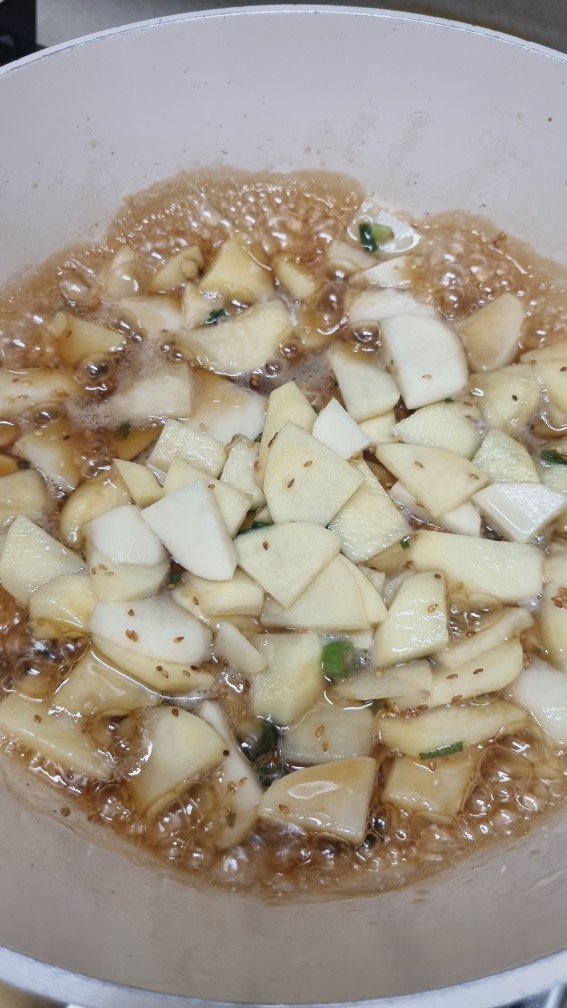 이 상태로 10분 정도 두면 감자의 수분과 전분기가 빠져나오면서 단맛이 입혀지게 됩니다.