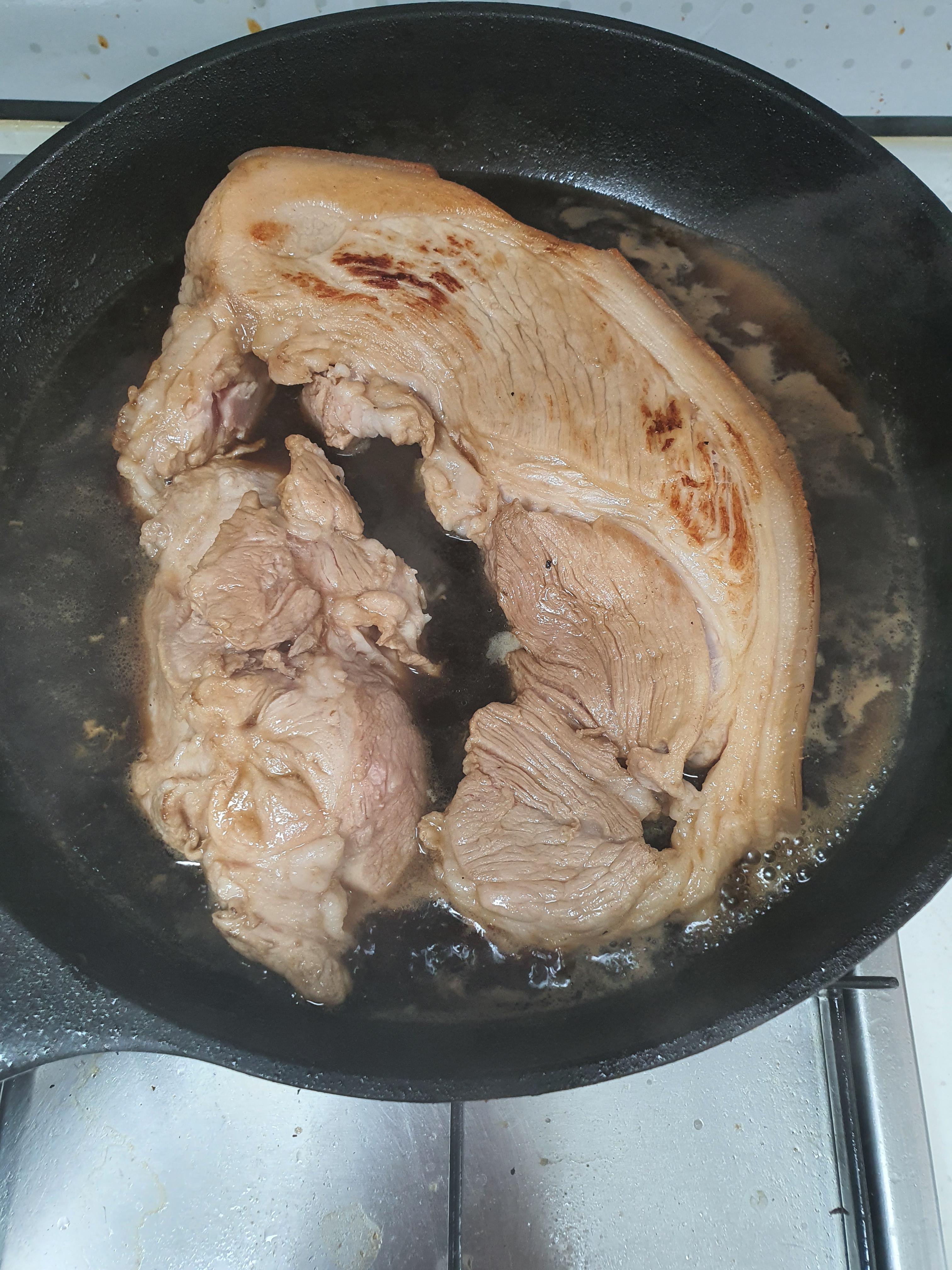 먼저 팬을 달구어 뒷다리살을 올려줍니다. 그 뒤 바로 물과 간장, 미림, 설탕을 다 넣어주어요!!!