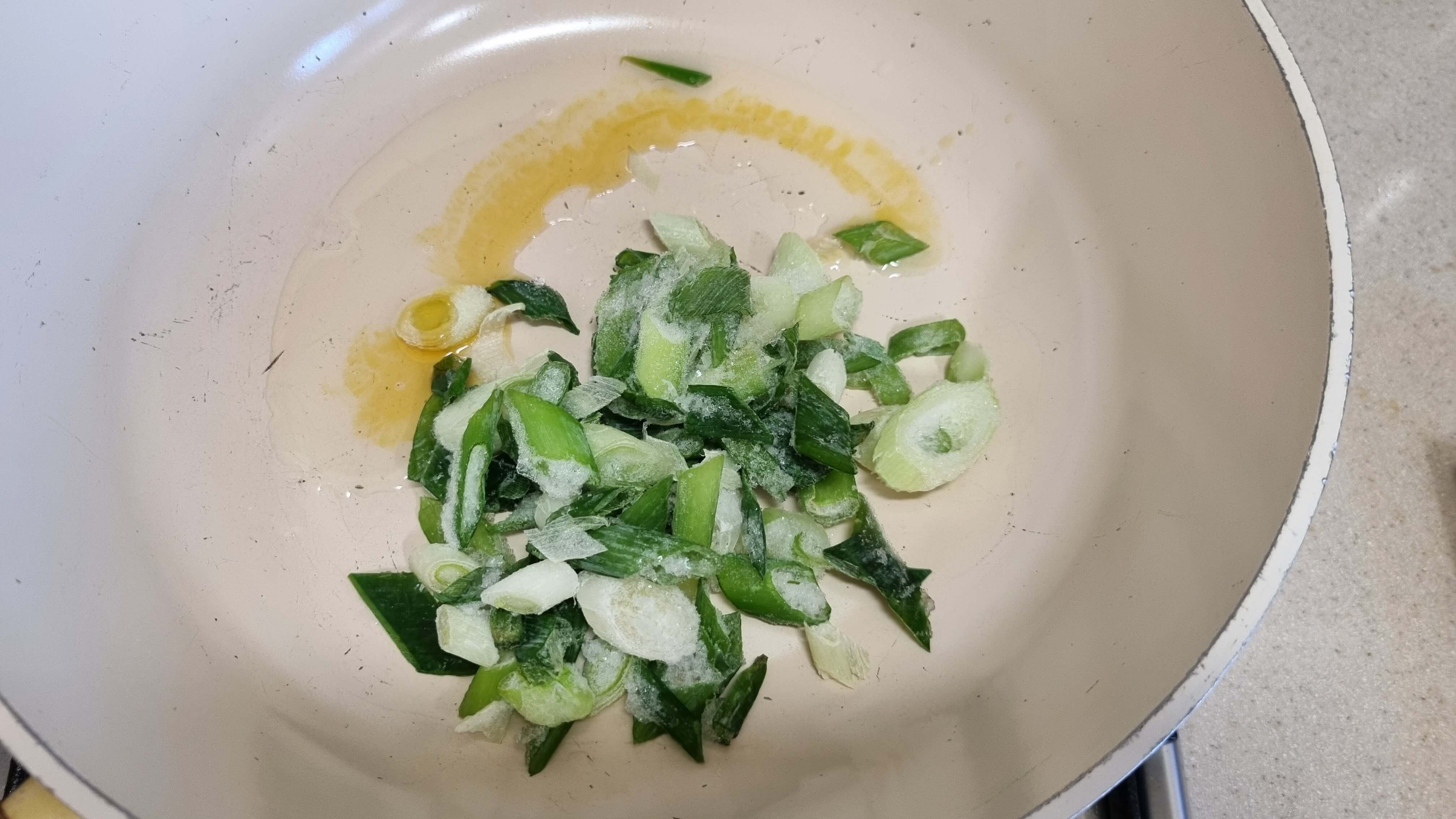 1. 팬 식용유 한 두 바퀴 정도 + 들기름 한 바퀴 둘러준 후 준비해 둔 대파를 넣어줍니다.