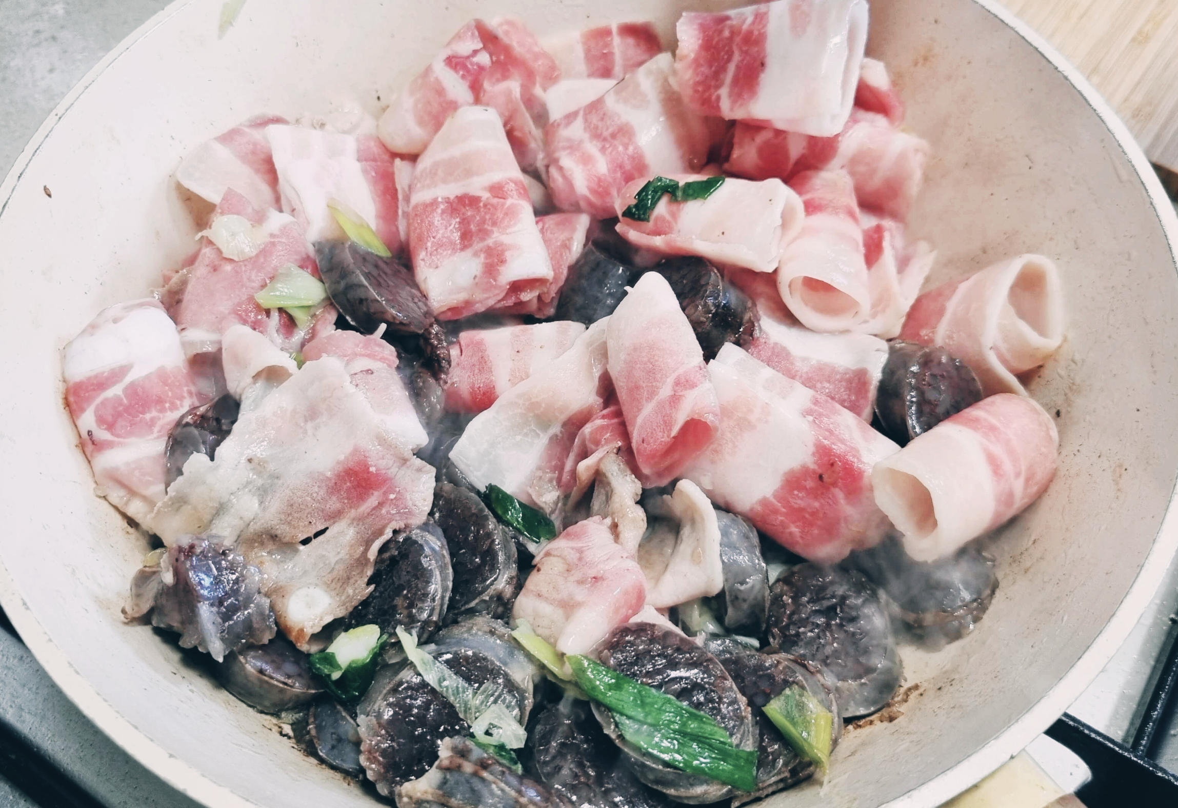 대패삼겹살이든, 냉동 삼겹살이나 일반 삼겹살도 함께 넣어주면 기름이 나와 더욱 맛있게 먹을 수 있었습니다.