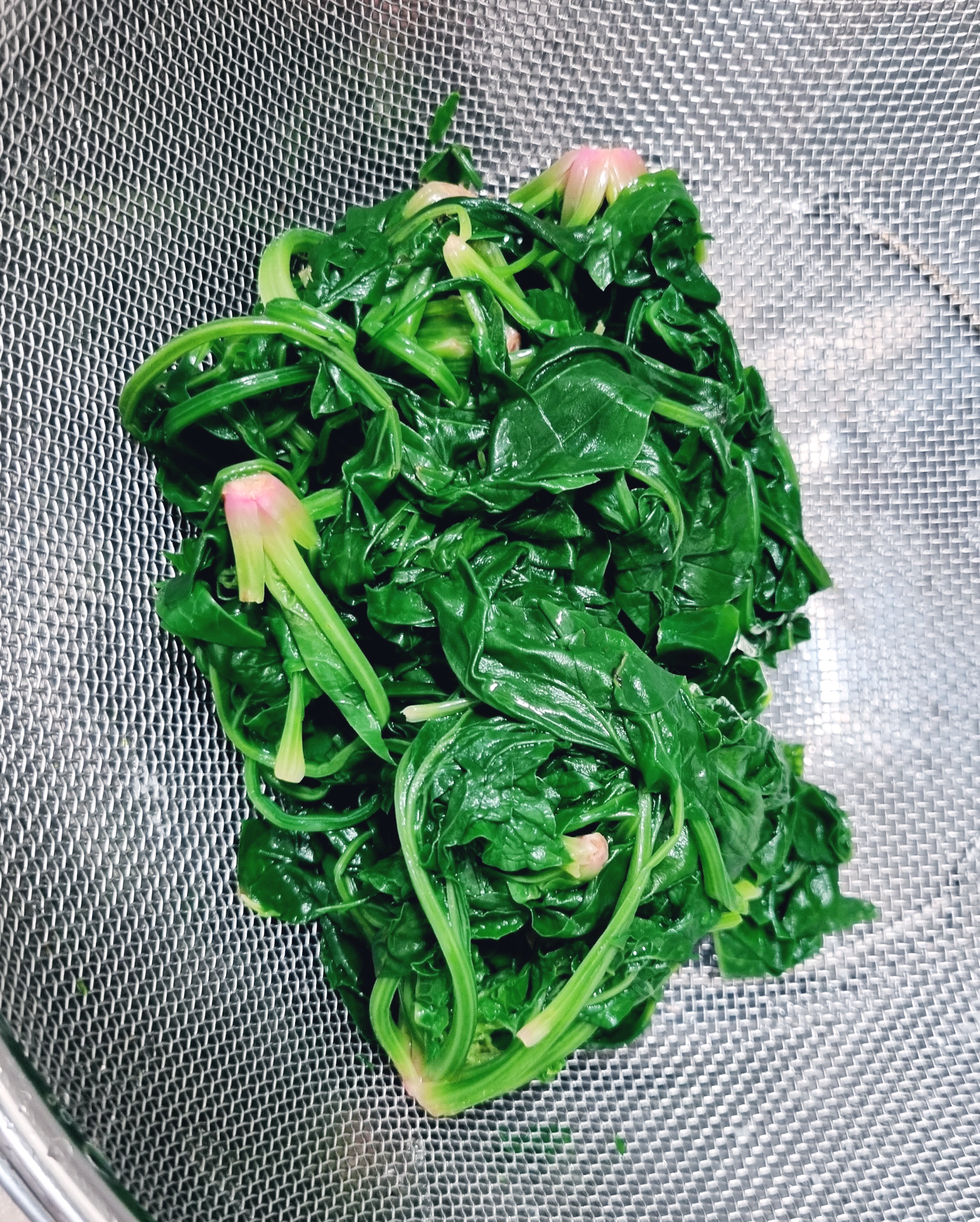 물이 끓으면 시금치는 잎보다 조금 더 두꺼운 뿌리부터 잠시 먼저 몇 초간 넣어주셨다가 잎까지 잠기게 넣어주시고,