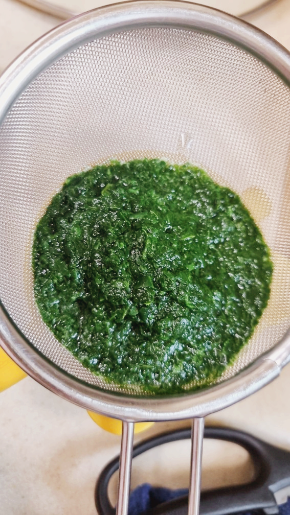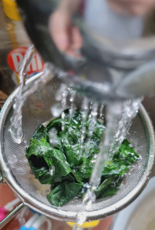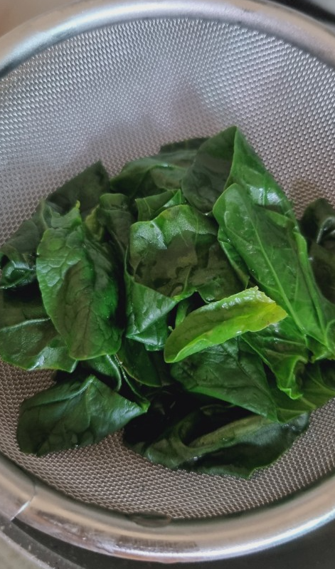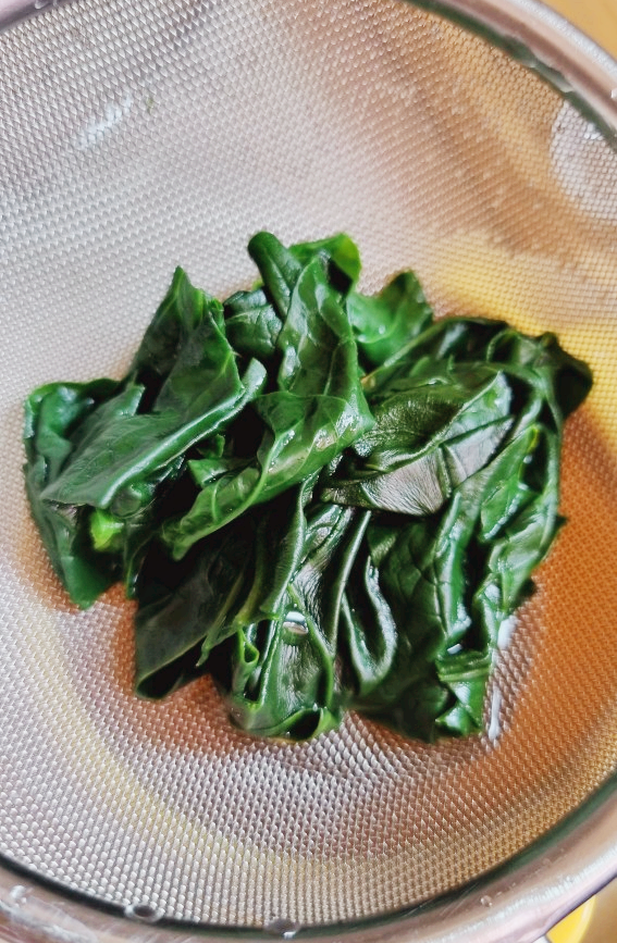 데친 시금치를 체에 밭쳐서 건져줍니다.