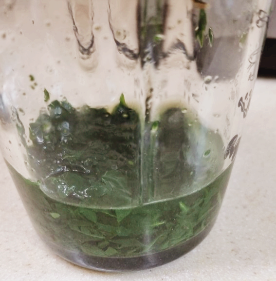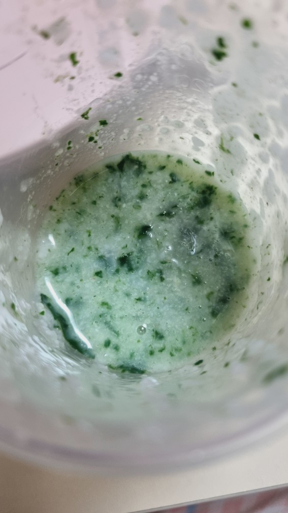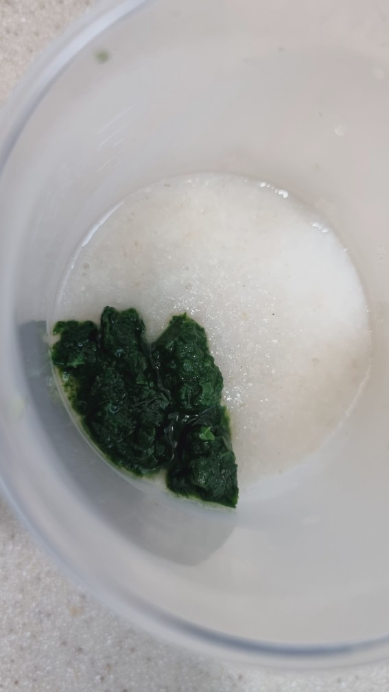 마지막에 짠 시금치 즙은 향이 있어서 갈아놓은 시금치와 함께 먹여보기로 했습니다.