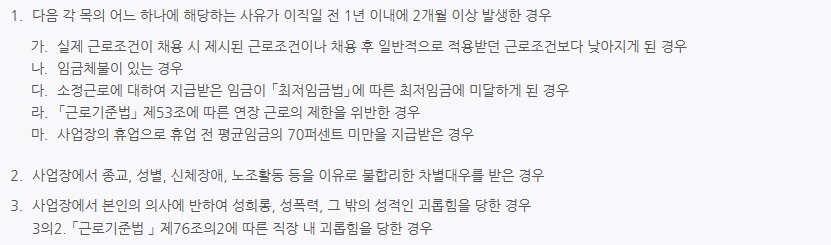 하지만 자발적인 퇴사인 경우에도 해당되는 조건이 있습니다.