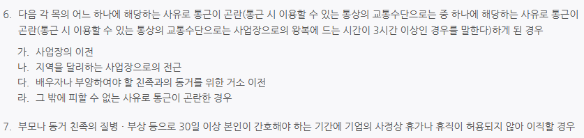 - 회사 이전, 전근 등 출퇴근하기 어려운 곳으로 발령 등의 경우(출퇴근 시간 기준 왕복 3시간 이상)