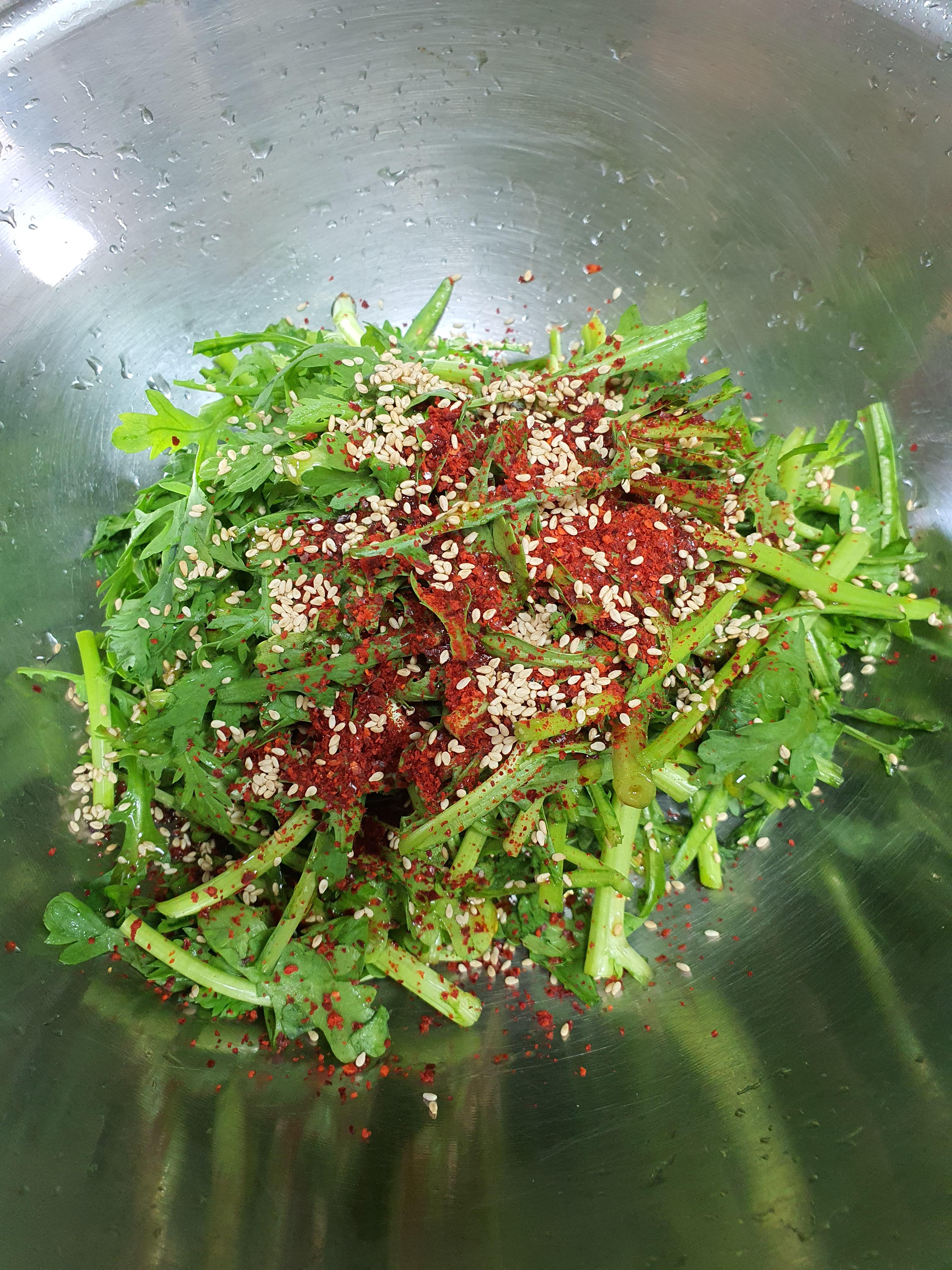 6. 쑥갓과 양념재료를 넣고 조물조물 버무려줍니다.