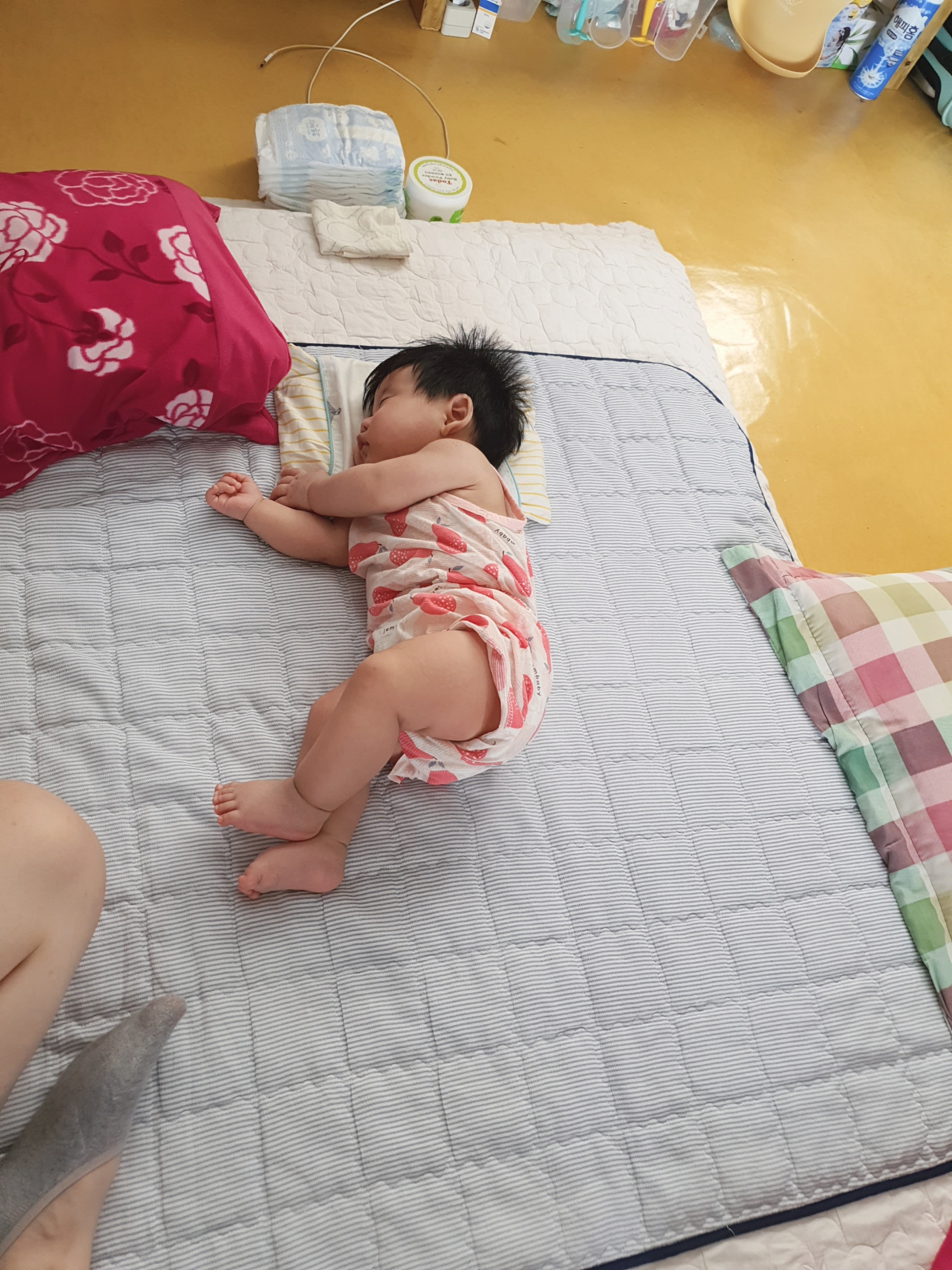 그렇게 깨더라도 다시 자세를 바꿔 잠을 청하네요. 한 번씩 저녁에 잠이 드는 등의 이유로 정량을 못 먹은 때에는 3시나 4시쯤에 깨버려서. 이럴 때는 좀 달래 보다가 안되면 한번 먹이고, 보통은 아침 6시에 첫 수유를 시작하고 있답니다.