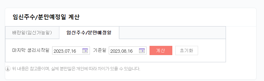 위와 같이 마지막 생리시작일을 입력하고 기준일을 입력하게 되면 계산은 완료가 됩니다.