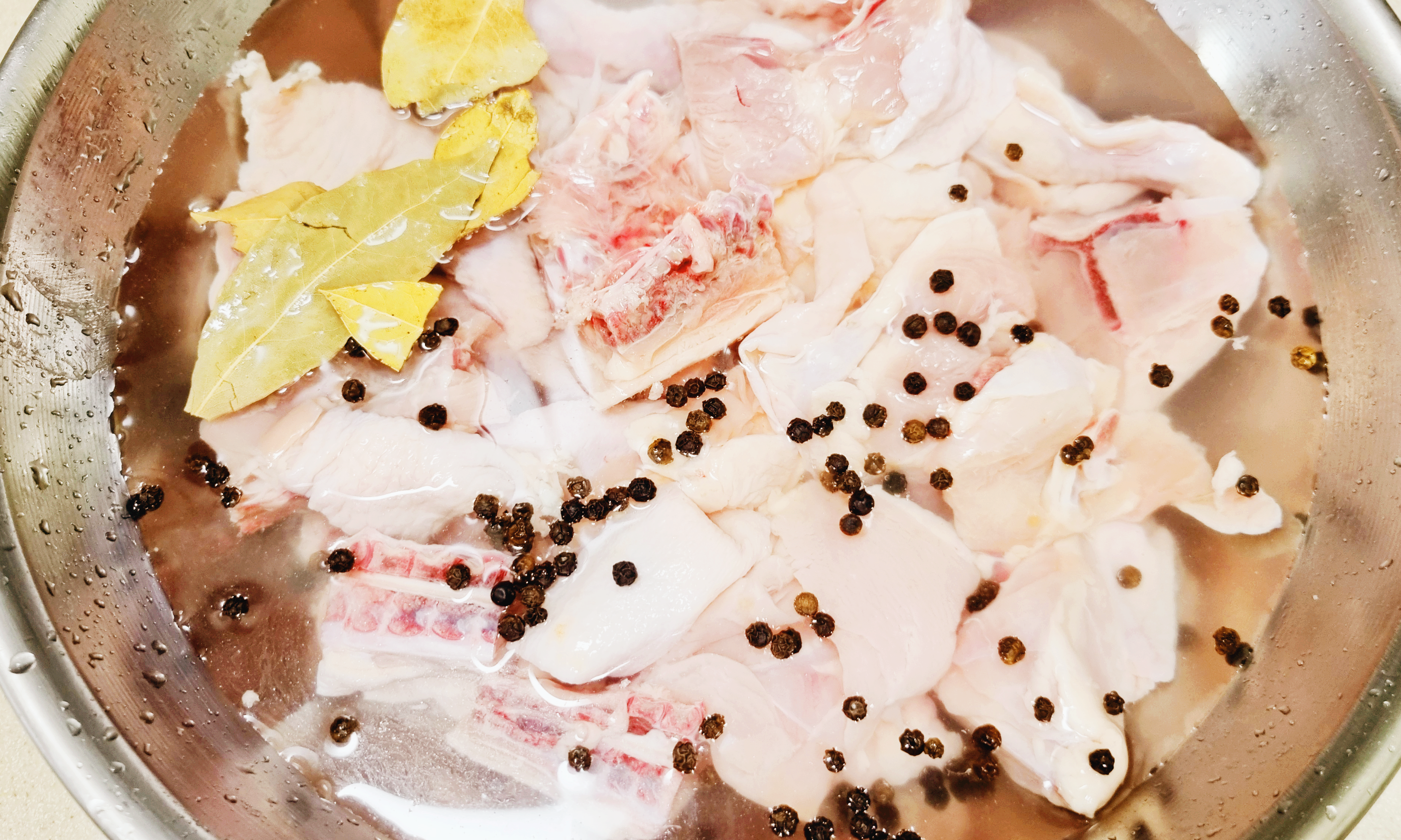 닭, 통후추, 월계수 잎, 물을 잠길 만큼 부어 센 불에서 한 번 끓여줍니다.