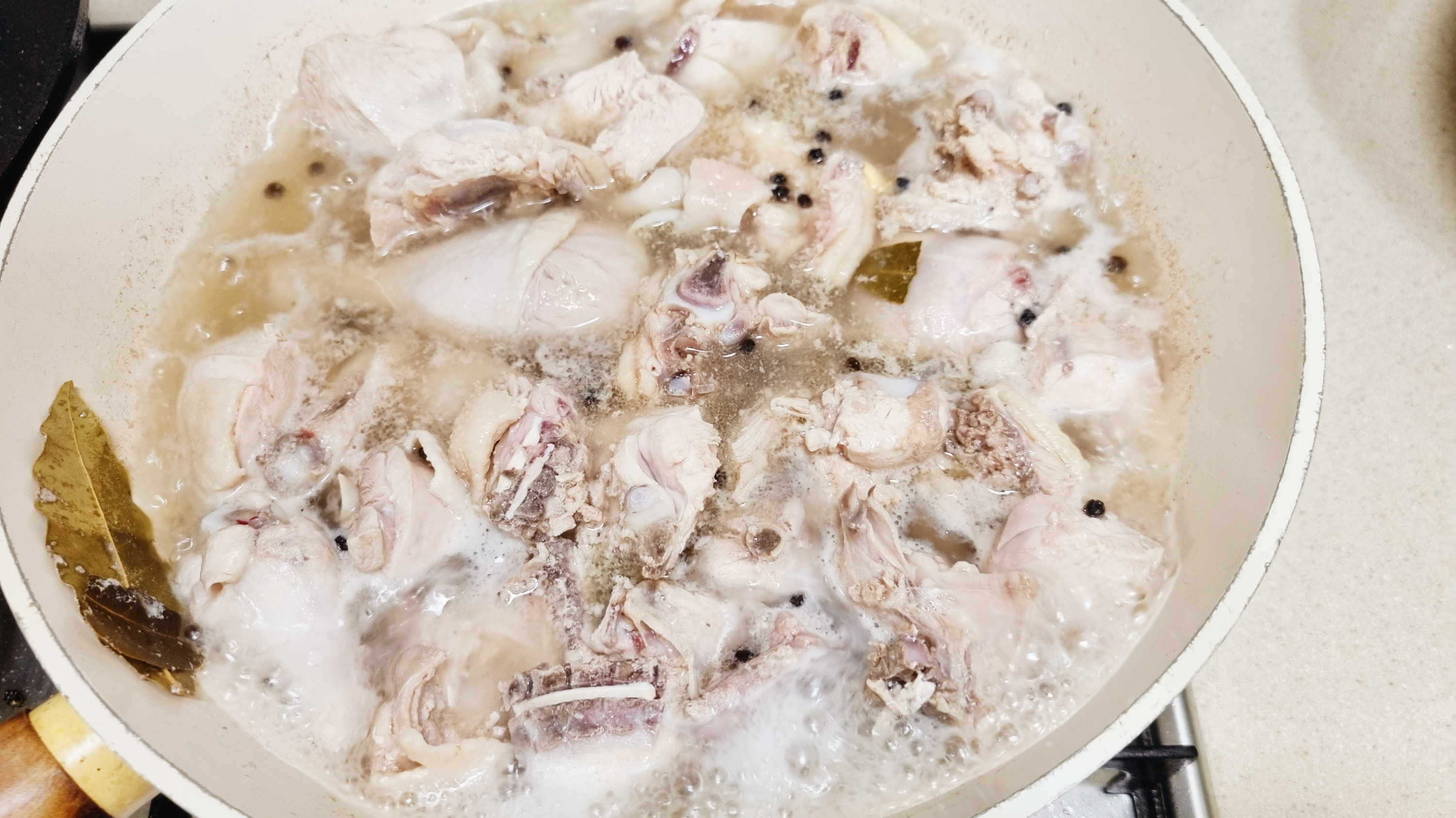 닭, 통후추, 월계수 잎, 물을 잠길 만큼 부어 센 불에서 한 번 끓여줍니다.