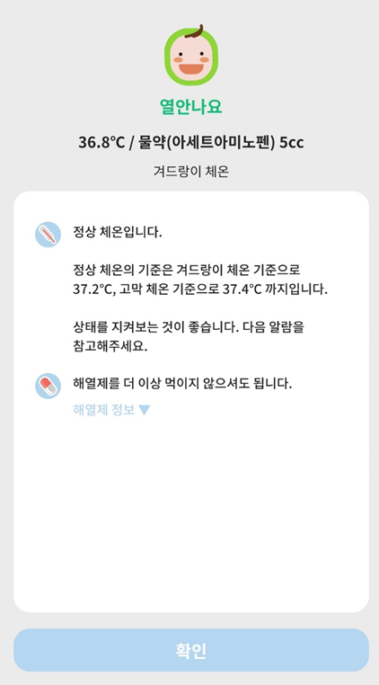 열이 내린 경우에는 이렇게 정상체온이라는 문구가 뜹니다. 이럴 때는 상태를 지켜보고 해열제를 더 이상 먹이지 않아도 된다는 것도 함께 알려 줍니다. 이런 식으로 구체적으로 지금 내가 뭘 해야 하는지를 잘 알려주는 어플이에요. 메인화면에도 이렇게 다음 측정시간이 한번 더 떠요.