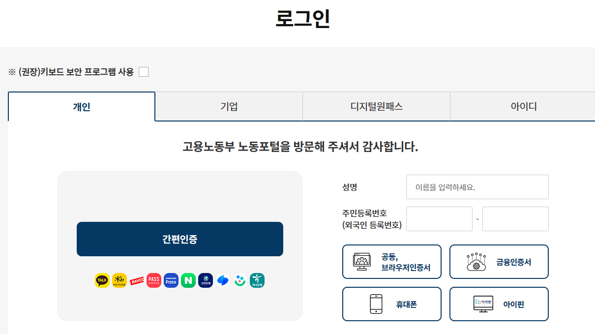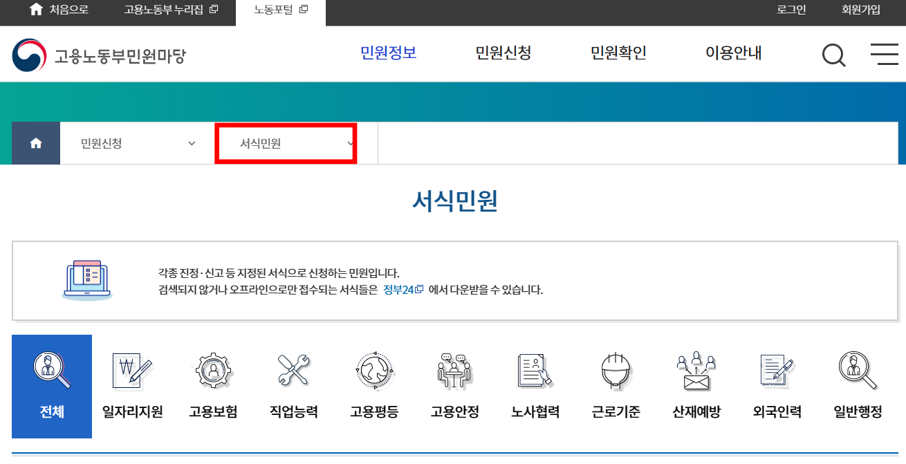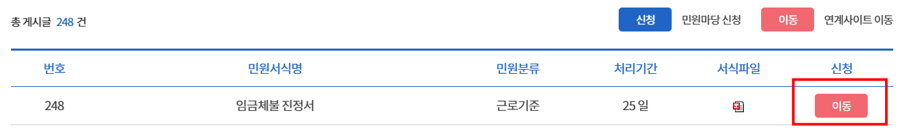 [이동]을 누르게 되면 [고용노동부민원마당]에 접속한 후