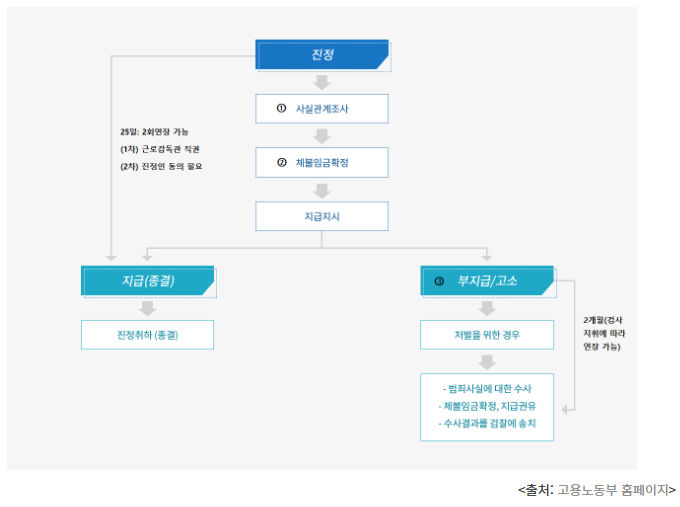 신청은 고용노동부 온라인 홈페이지에서 온라인으로 민원을 제기하거나 사업장 관할의 고용노동부 고객지원실을 방문하여 상담이 가능하며 상담 후 해당 사업장에 대해 진정이나 고소를 진행할 수 있습니다.