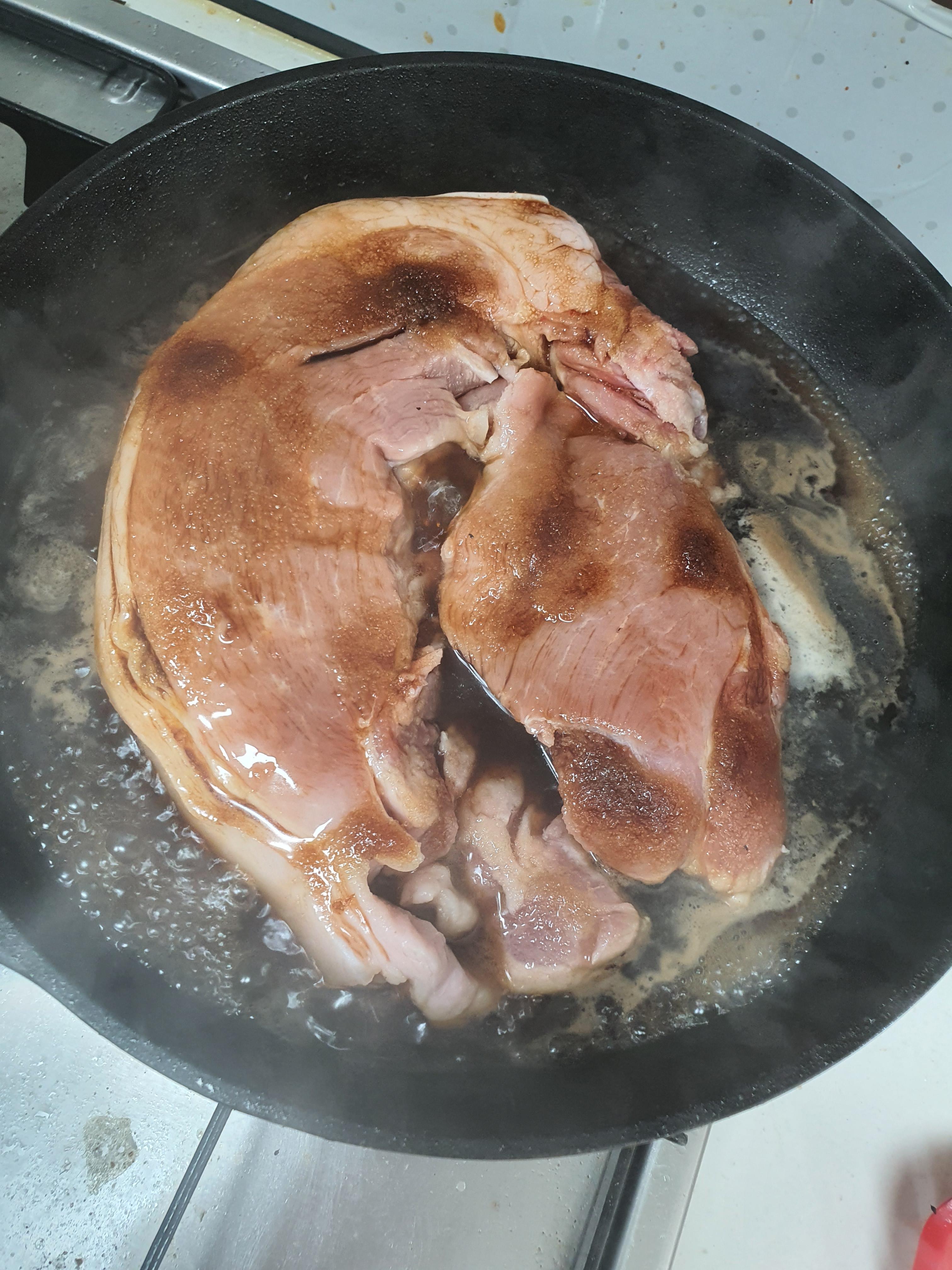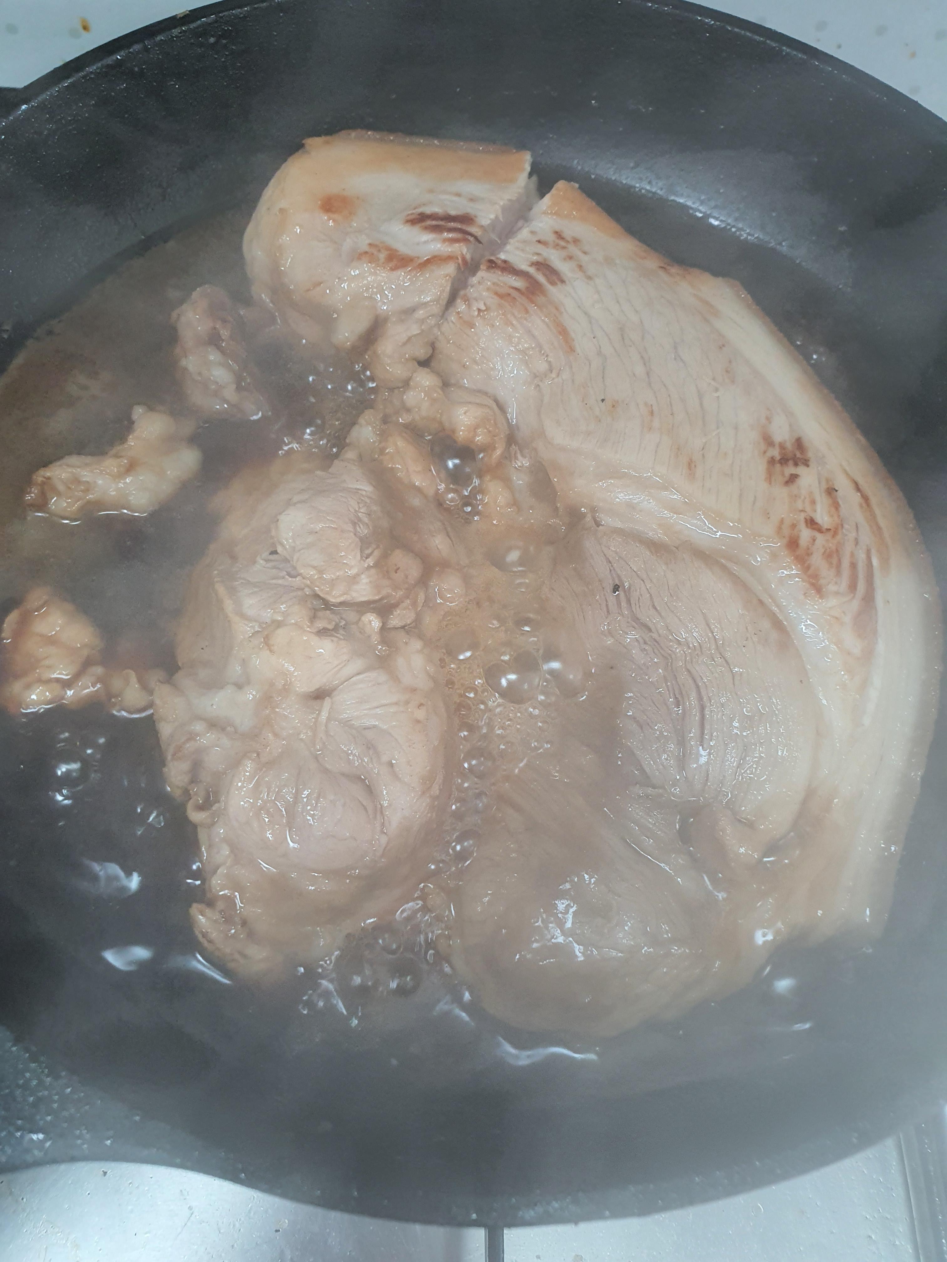 먼저 팬을 달구어 뒷다리살을 올려줍니다. 그 뒤 바로 물과 간장, 미림, 설탕을 다 넣어주어요!!!
