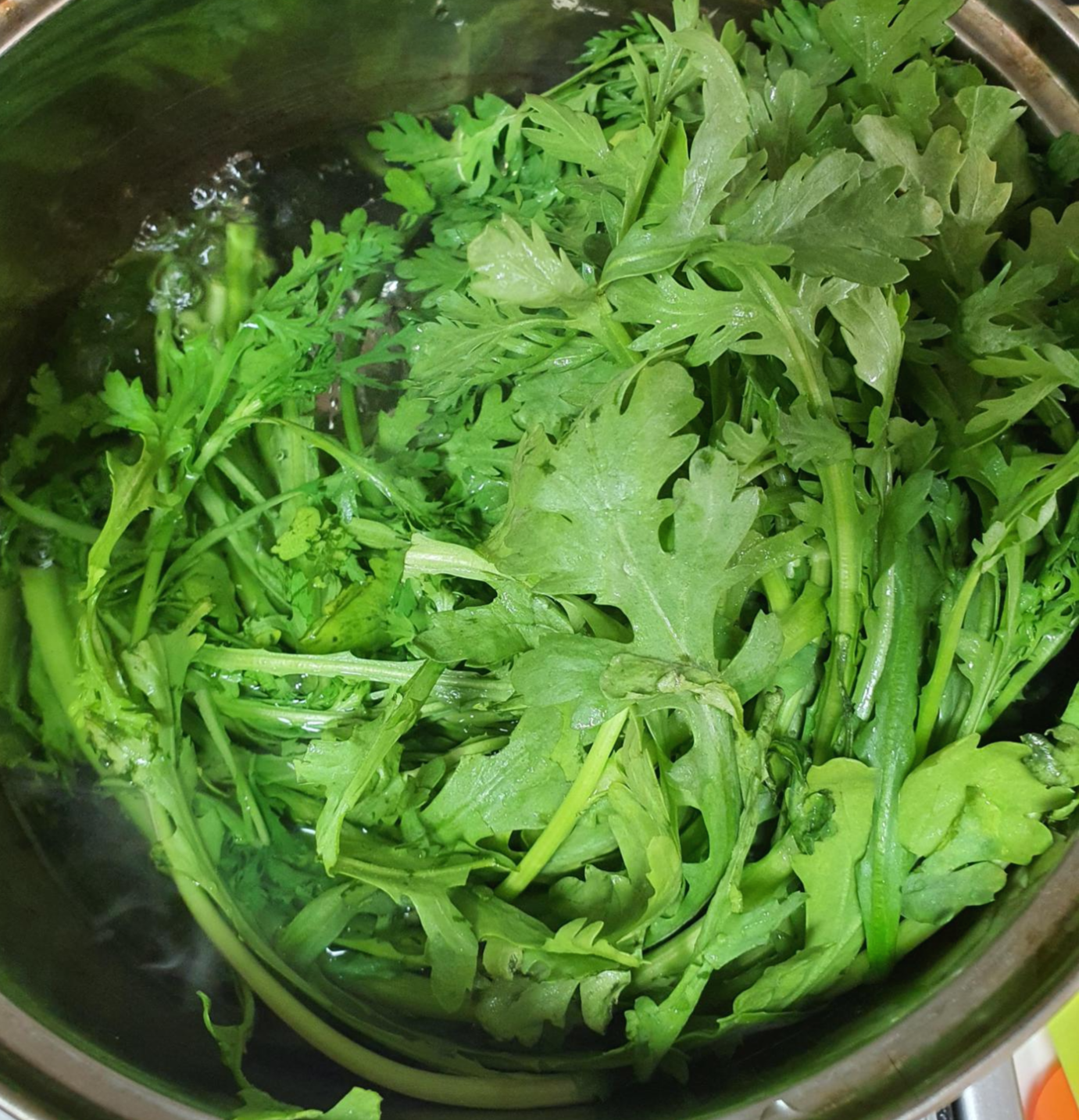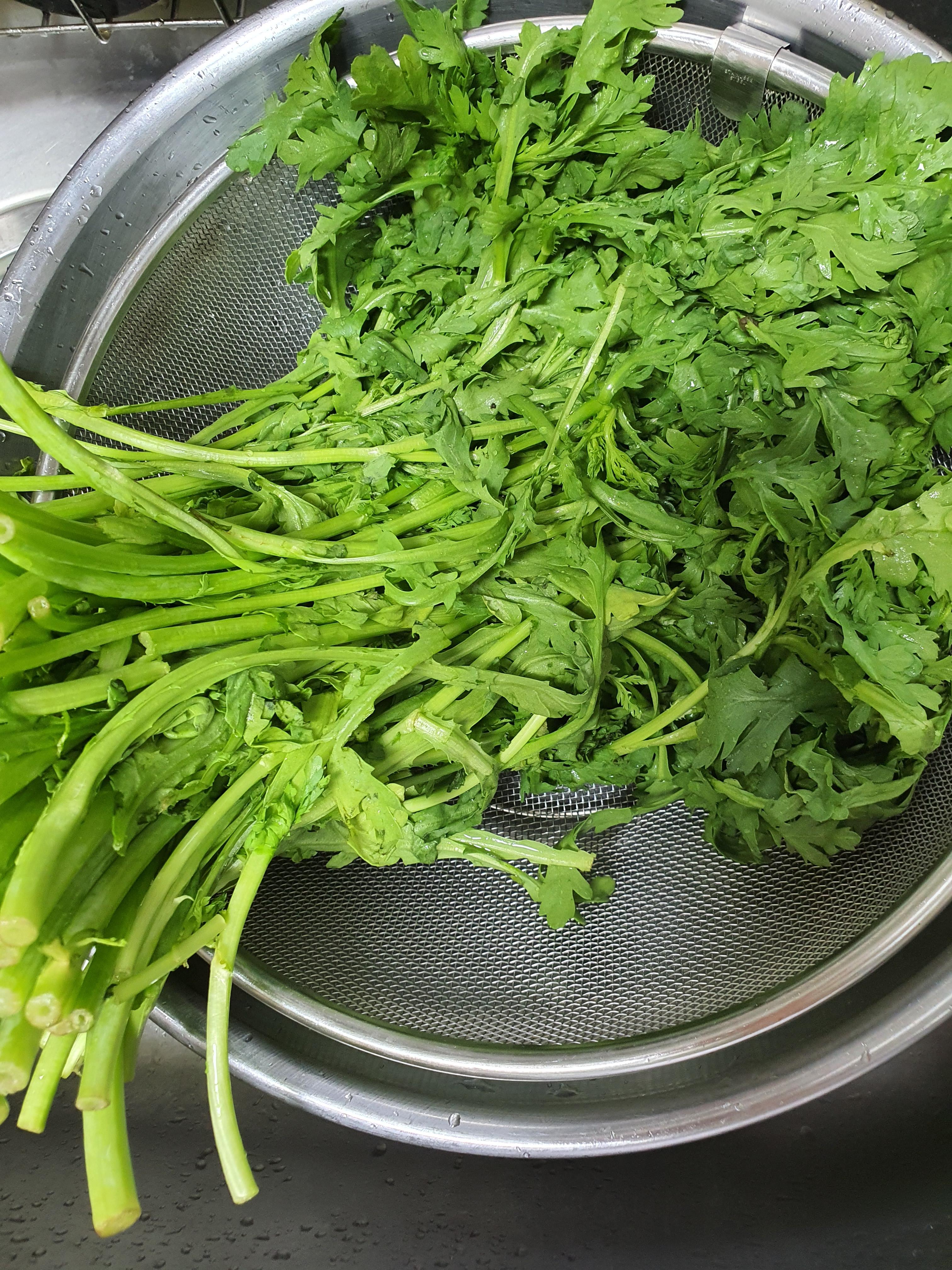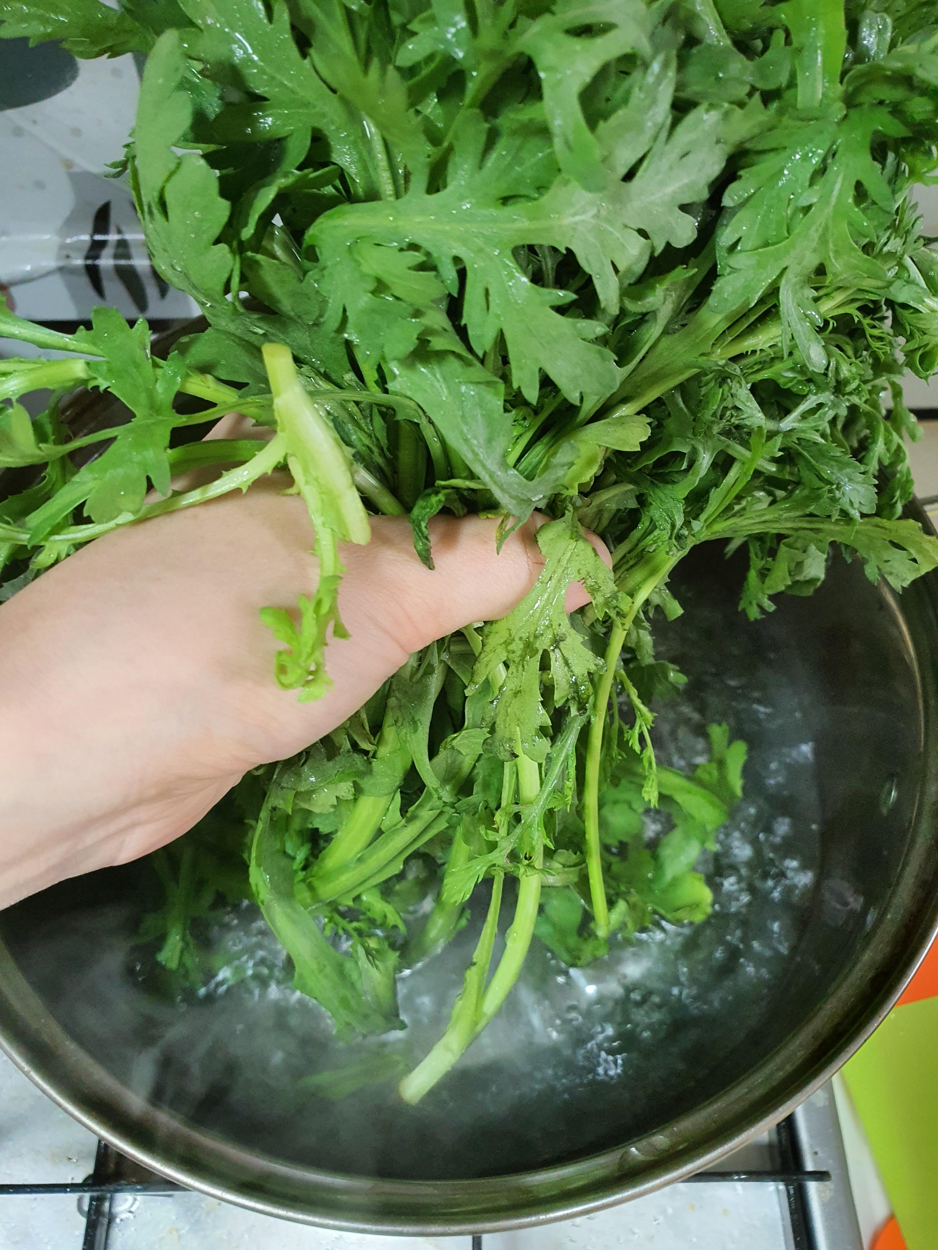 3. 씻어놓은 쑥갓을 살짝만 담갔다 빼주세요.