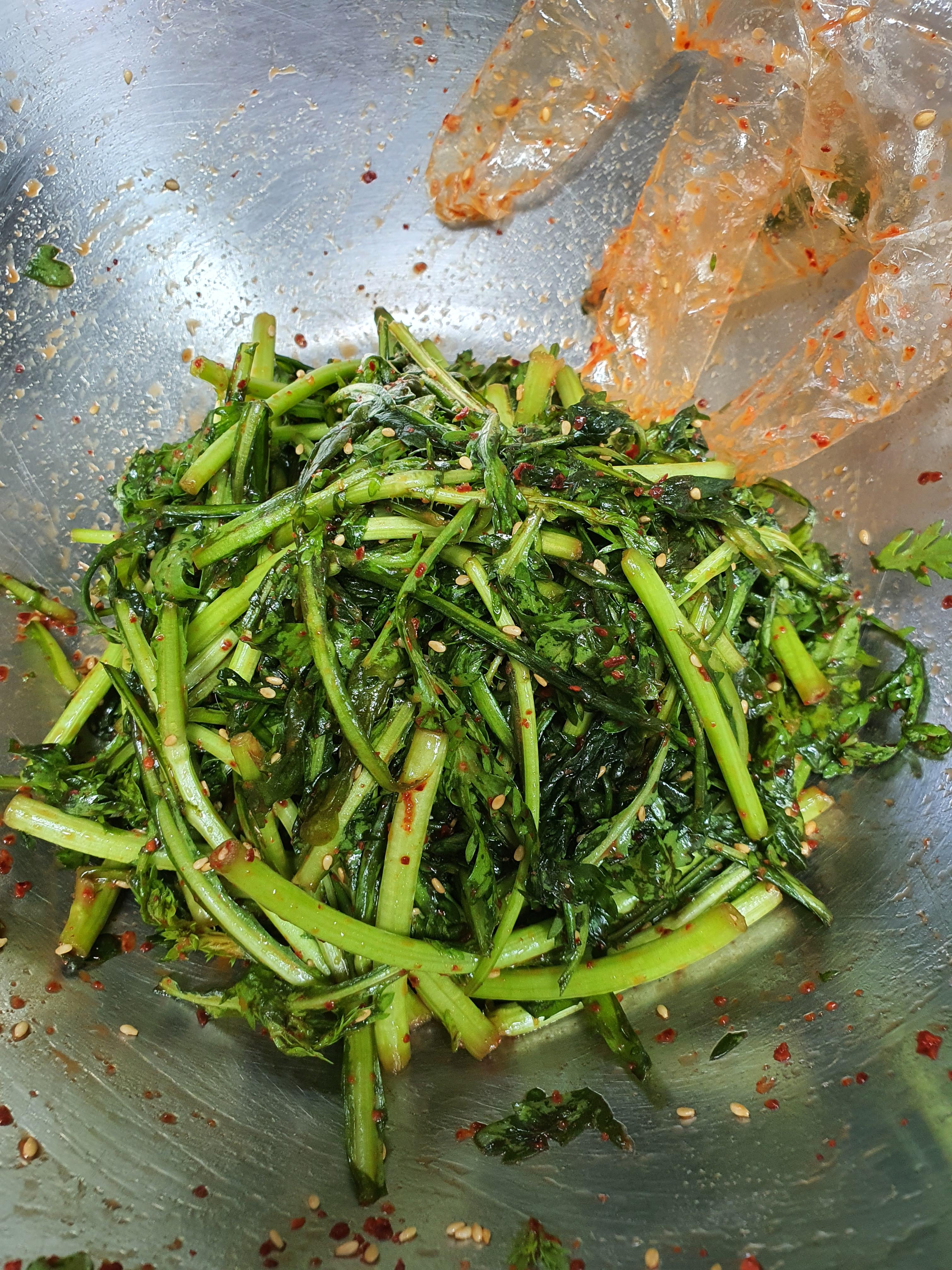 6. 쑥갓과 양념재료를 넣고 조물조물 버무려줍니다.