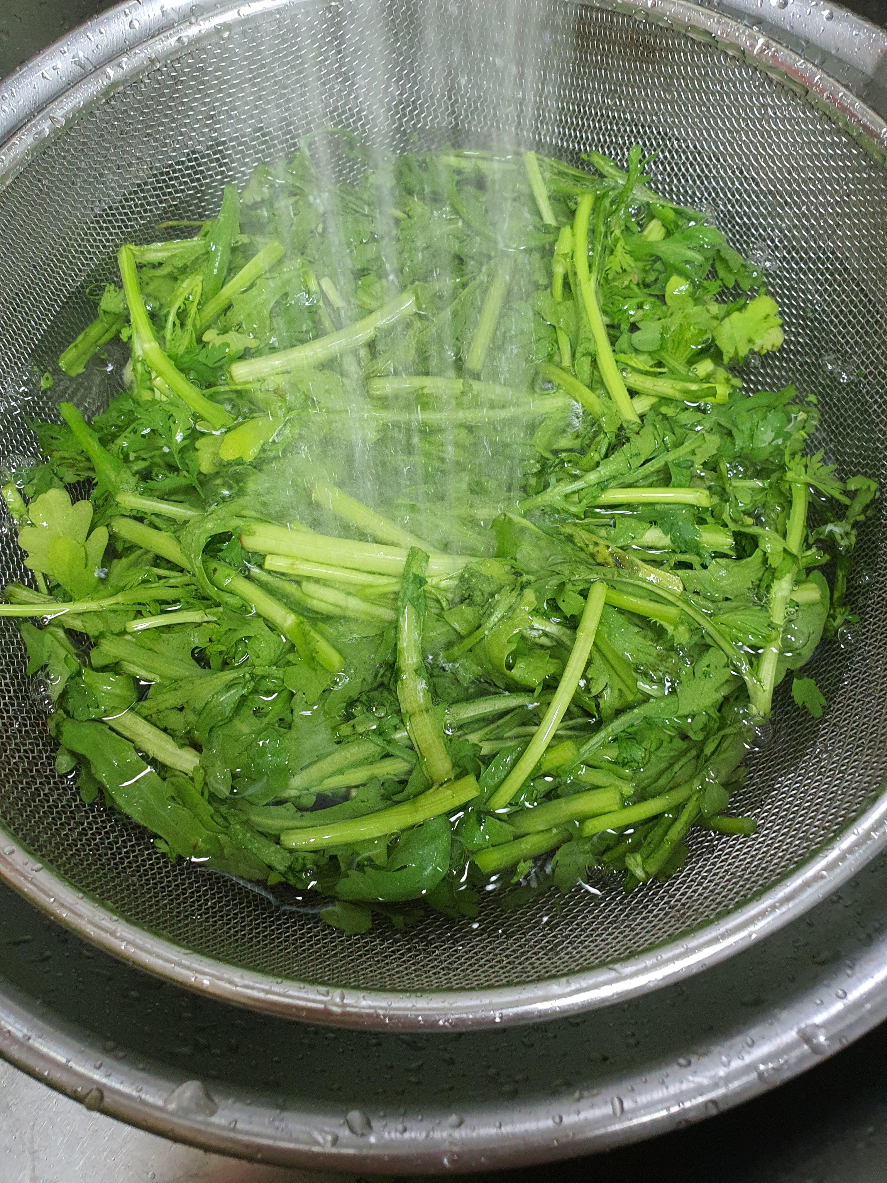 4. 데쳐낸 쑥갓은 찬물에 헹구고 손으로 짜 물기를 어느 정도 제거해줍니다.